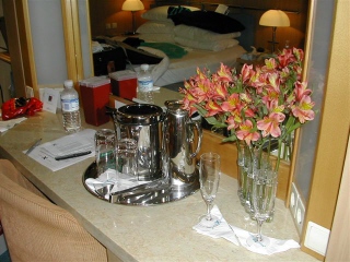 {Suzy Photo: Flowers freshened regularly are part of Concierge Class cabins, as well as some champagne upon arrival}