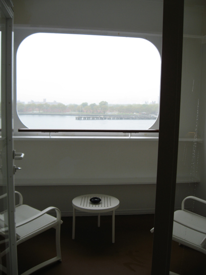 The Canada & New England cruise got off to a bad start when we got to our cabin and had a note from the Captain that hurricane Kyle was barreling up the Eastern Seaboard directly in our same itinerary path. Because of that, our itinerary was severely modified. Instead of sailing from NY on Saturday evening, we would stay docked overnight in Brooklyn, and then have to give up our berth for another ship at 6am. We would then sail out into NY Harbor and drop anchor near Staten Island, allowing the storm to pass by in the ocean while we stayed safely in the Harbor all day Sunday. What was REALLY irritating though, is other ships sailed out Saturday evening on schedule! What we later learned was those ships were doing US East Coast first, and Canada second. Since we were scheduled to do Canada first and then sail back down to NY, we would be going right in it's path. Why the Captain didn't decide to just flip our own itinerary around is beyond anyone's comprehension.