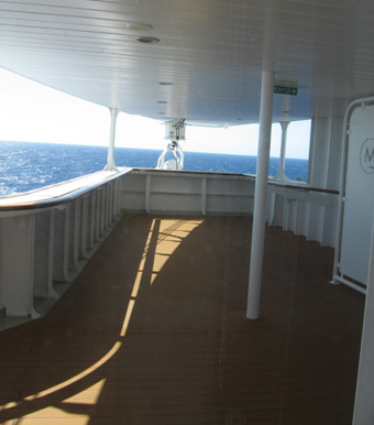 Queen Mary 2 is really a unique ship. When Cunard launched her in 2004, they made a huge deal about how she was an ocean LINER and not a cruise ship. And she truly is totally unique from any other ship. She has a very tall and very sharp pointed hull, meant for slicing through heavy seas of the North Atlantic. Regular cruise ships are like floating boxes by comparison. The main public decks where dining and shows are happen to be decks 2 and 3 – very low for stability and comfort as far as her decks top to bottom, but still high compared to other ships. And her buffet and spa and other lounging areas are on Deck 7. Very much in the middle of the ship, not up at the top. Her main pool area is actually at the aft of the ship, where she is tiered and open for sunning on many deck levels...safe from the wind as she moves. At the very top of the ship, Deck 12 and 13, there is a barren flat wooden deck. It's hardly used. And when she is moving, those decks are usually roped off because of the winds.